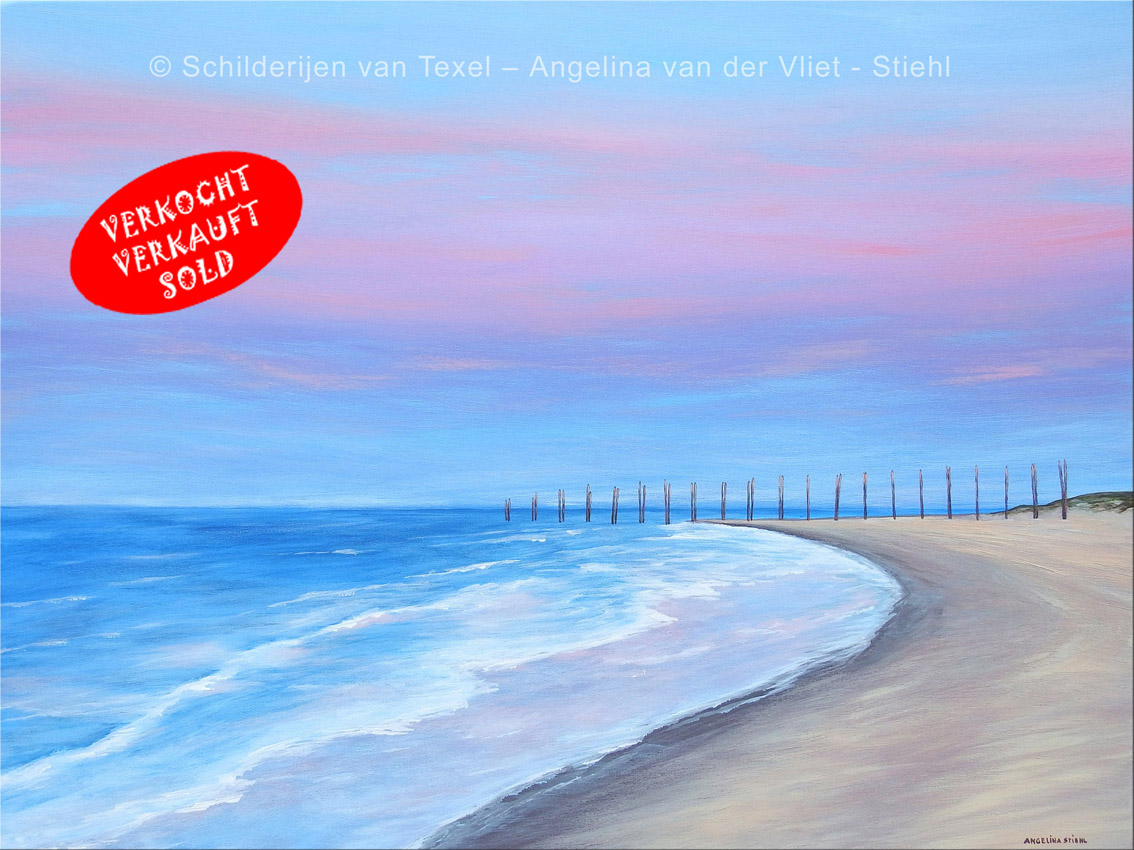 Het Paal 33 strand en de Steiger van Sil met avondgloed. Acrylverf op katoen 60x80cm.(verkocht)