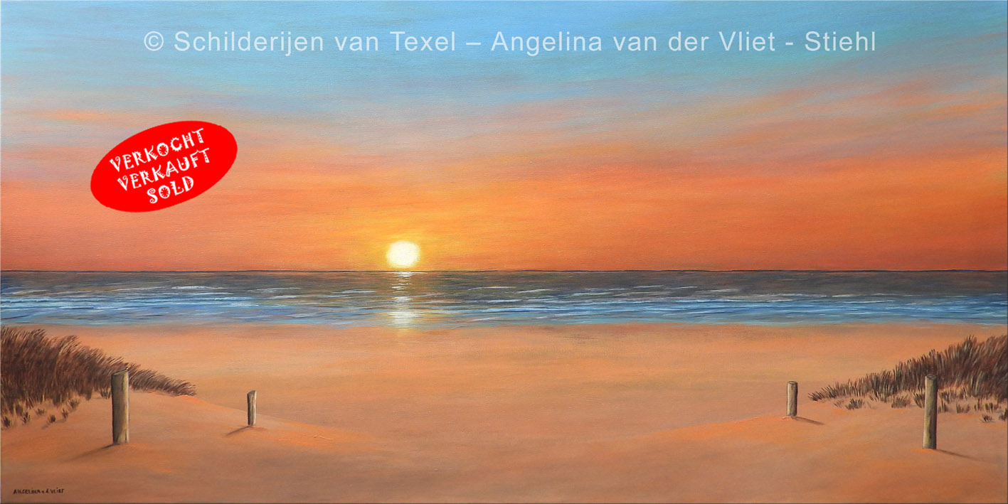 Texelse strandopgang met zonsondergang. Acrylverf op katoen 50x100cm.(verkocht)