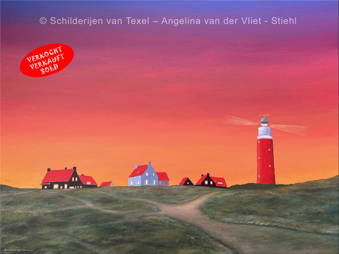 Zonsondergang bij de Texelse Vuurtoren. Acrylverf op katoen 60x80cm. (verkocht)