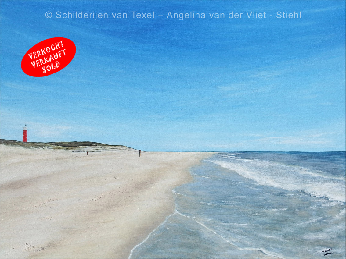 Het Paal 33 strand richting de Texelse Vuurtoren. Acrylverf op katoen 60x80cm. (verkocht)
